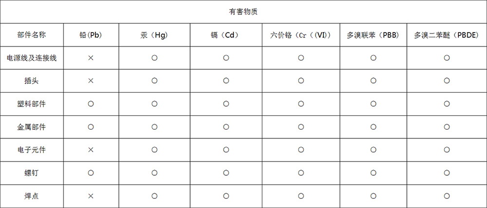 2、由于目前行業(yè)配套技術(shù)水平達(dá)不到等因素,產(chǎn)品的少數(shù)部件中還存在限用物質(zhì)(見(jiàn)附表:限用物質(zhì)統(tǒng)計(jì)表)。消費(fèi)者在使用過(guò)程中并不會(huì)出現(xiàn)限用物質(zhì)影響消費(fèi)者健康的問(wèn)題,可以放心使用。